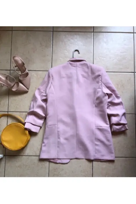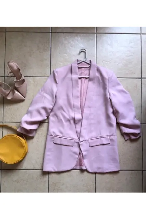 Hermoso blazer manga 3/4. Hermoso blazer, manga 3/4 drapeadas, simulación de dls bolsas delanteras, diseño sin botones, color rosa bebé Talla M. / Nuevo sin etiqueta. Medidas. Hombro: 40 cm. Pecho: 49 cm. Largo: 68 cm. Manga: 50 cm. Estira: No. Detalles: No