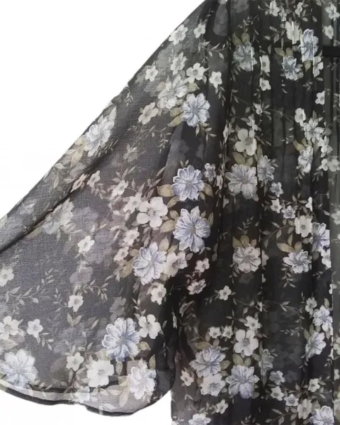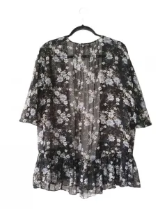 Kimono negro con flores azul gris talla XS/S oversize, queda a una talla M, con manga amplia de la marca American Eagle. El producto es usado en excelentes condiciones sin detalles. Proviene de un hogar libre de humo de tabaco y mascotas.MedidasHombros: 42 cmsSisa: 68 cmsLargo: 74 cms100% poliéster