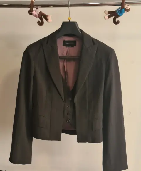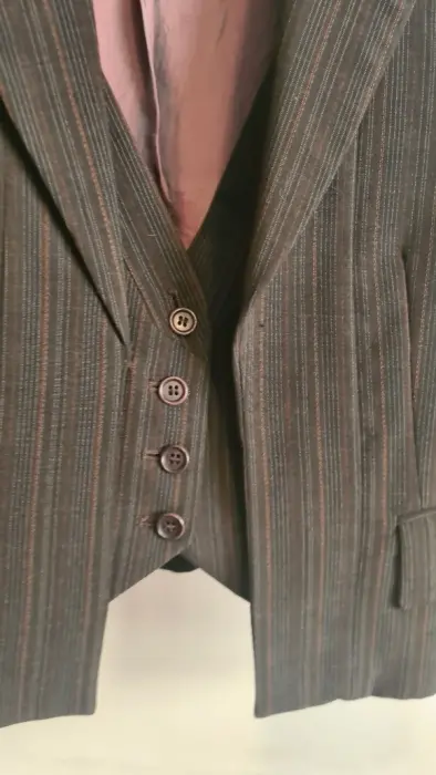 Lindo blazer de color café rayado con chaleco integrado, para un atuendo formal, el único detalle es que la etiqueta se descosio un poco ya no la cosi de nuevo para no maltratar el forro, el foto está integro. Medidas hombro a hombro 38cm, axila a axila 43, largo del cuello a la base 50cm, hombro a la muñeca 59cm
