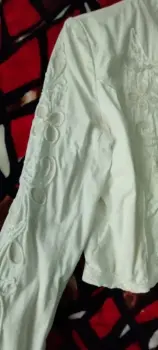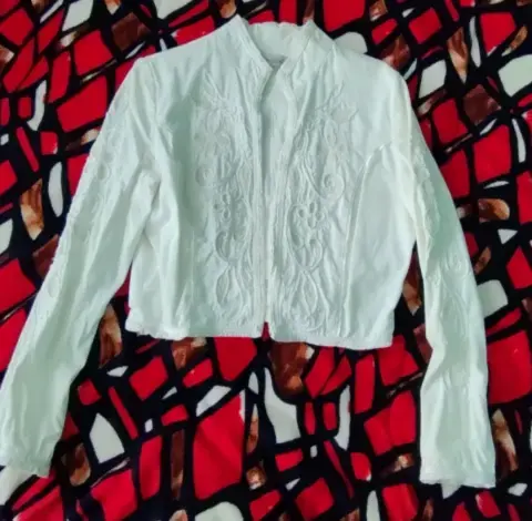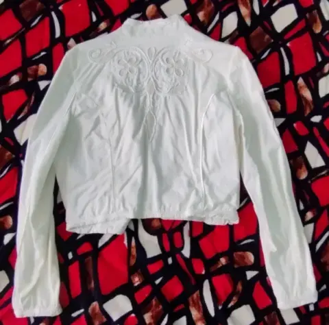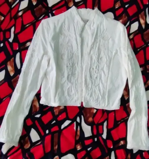 Saco tipo toreritocon bordados color crema, de tela de manta con bordados, talla Ch.