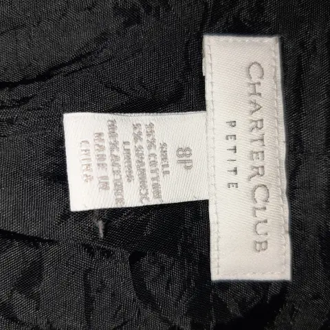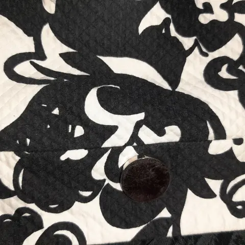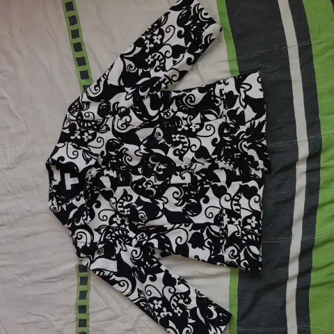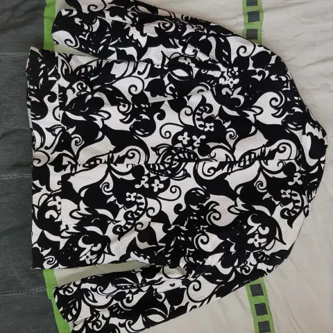Saco estampado blanco/negro manga 3/4 botones plateados (le falta uno), tela tipo colchón, buena vista. Talla 8 petite