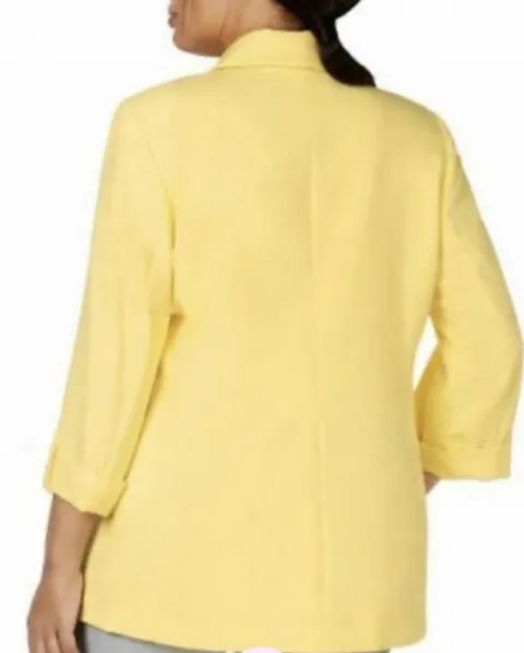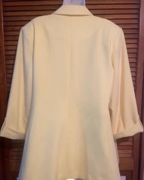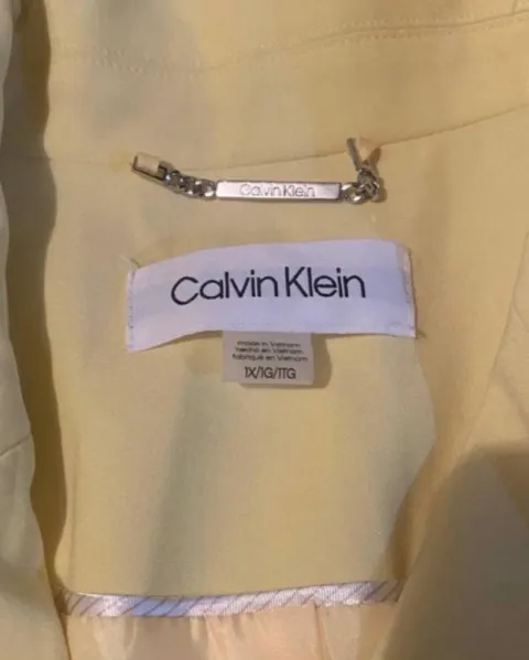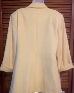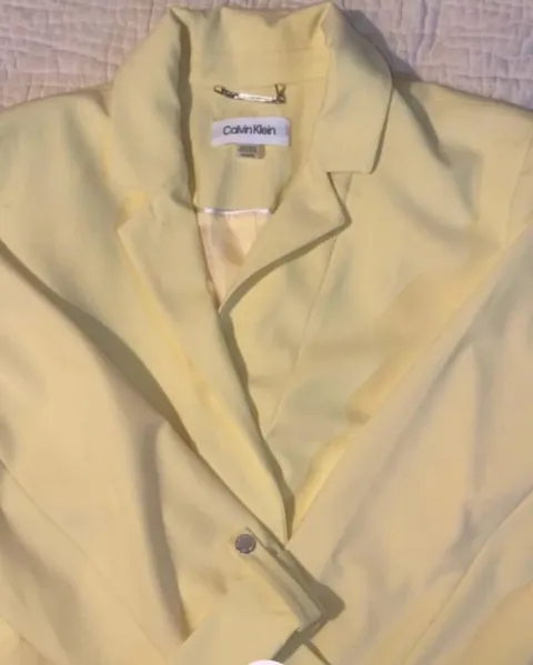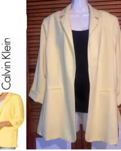 Saco amarillo Calvin Klein 1XL. Saco amarillo claro amplio mangas 3/4 boton y plaquita grabada NO INCLUYE TOP NEGRO solo se lo puse para resaltar color y se vea mejor tiene algunas manchas de polvo
