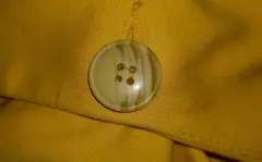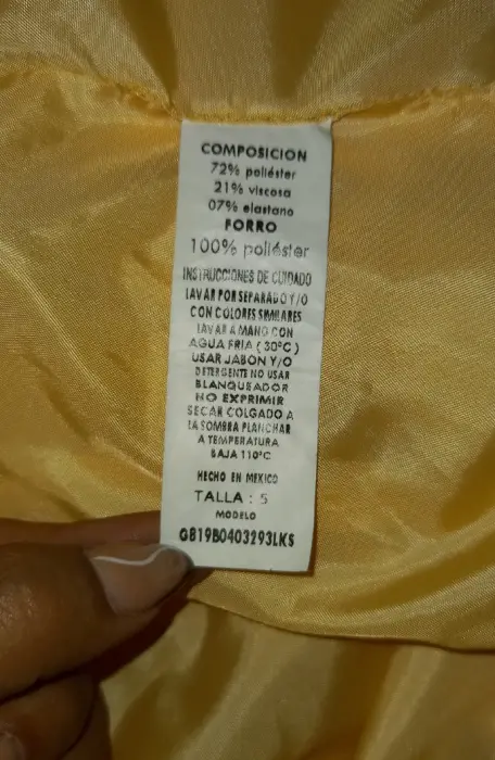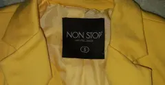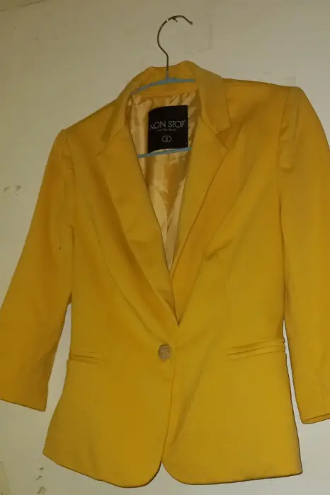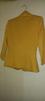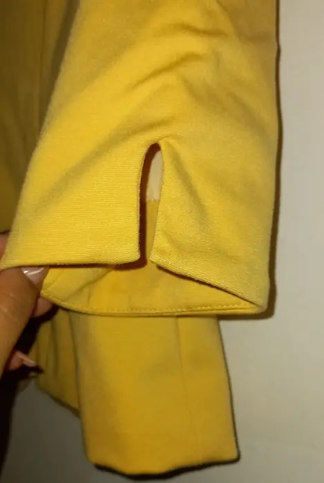 Saco amarillo de manga corta al codo, corte V, hombreras discretas, y bolsas delanteras decorativas.