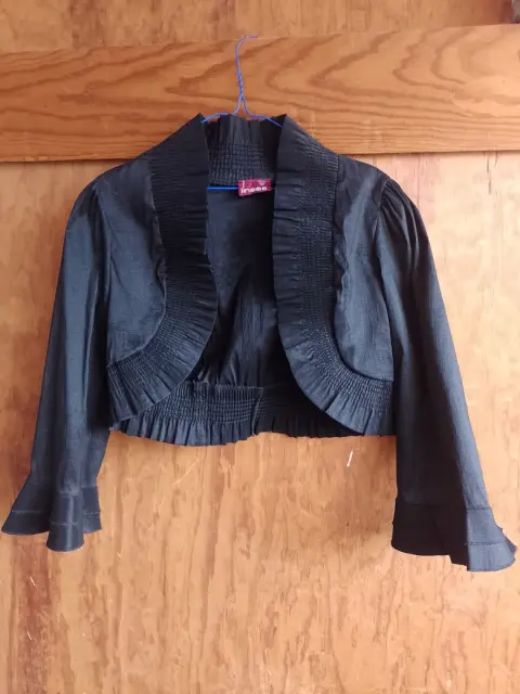 Esta prenda es un saco o bolero color negro, perfecto para ocasiones formales y que sea usado sobre un vestido, o algo similar. Es perfecto y es de una tela algo gruesa con perfecto detalles.