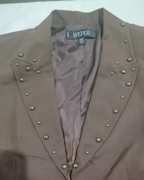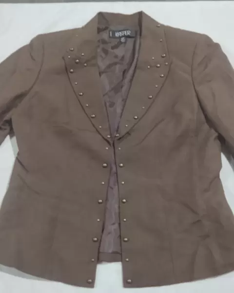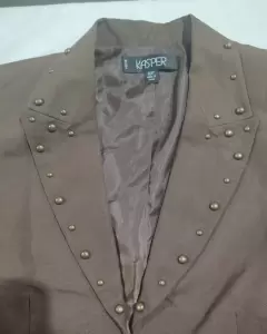 Saco café. Saco manga 3/4 con detalle de estoperoles redondos en el filo de la solapa