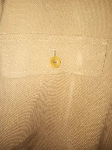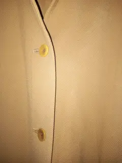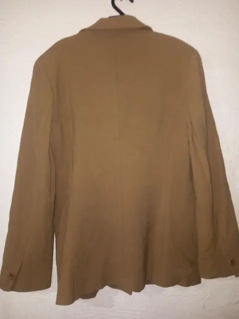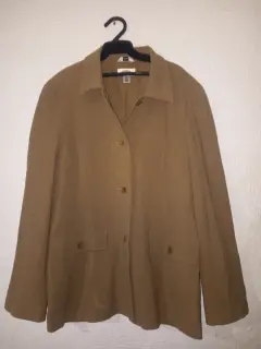 Saco café para econ dos bolsas al frente, con 8 botones, uno en cada bolsa y en cada manga. Cuenta con forro. Mide de axila a axila 94 cm y de largo 72 cm.