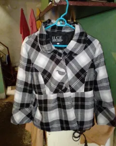 Saco con cuadros laterales,color negro con gris,con botones enfrente y cuello,manga larga,talla 9.