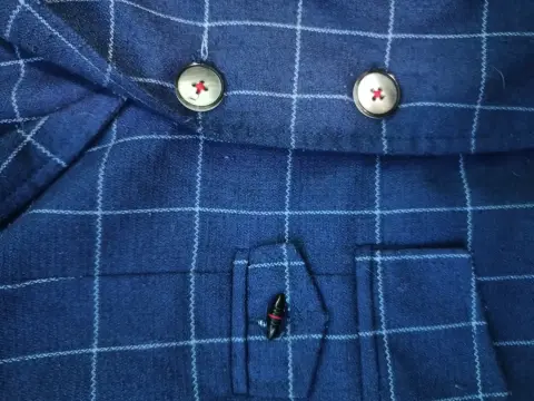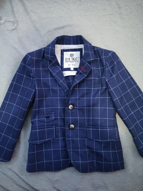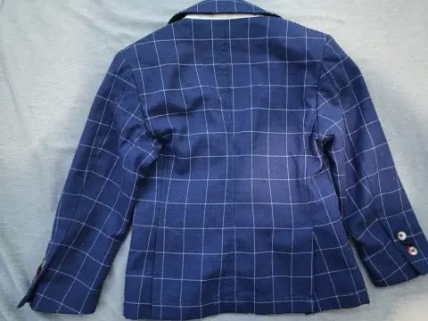 Saco de niño, talla 6, color azul rey a cuadros con líneas blancas, bolsillos delanteros solo de decoración, forro de poliéster, con una ligera y pequeña mancha en la solapa derecha