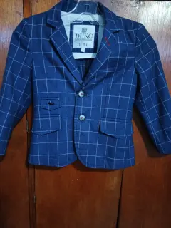 Saco de cuadros de niño. Saco de niño, talla 6, color azul rey a cuadros con líneas blancas, bolsillos delanteros solo de decoración, forro de poliéster, con una ligera y pequeña mancha en la solapa derecha