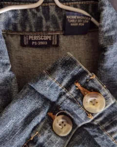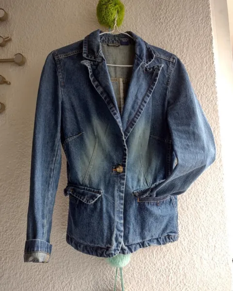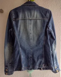 Saco de mezclilla retro. Mezclilla rígida ideal para vestidos o casual. Solapa retro, bonitas en puños y frente, bolsillos y forma acinturada