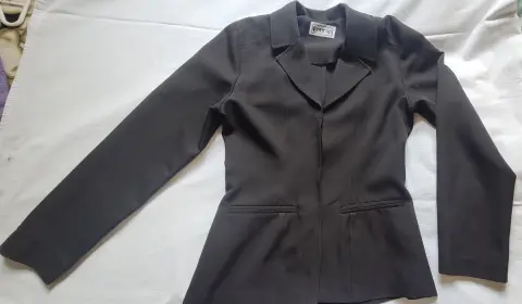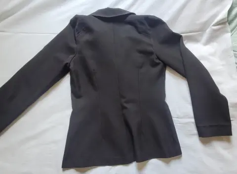 Saco de uso en buen estado. Saco negro, talla small, se ajusta perfectamente al cuerpo por los cortes del saco, tiene una ligera marca en la manga de dobles. Y se puede abrochar enfrente o dejar abierto