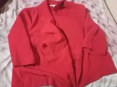 Saco rojo en buen estado, tiene hombreras para levantar, es abierto pero luce muy bien con prendas megras