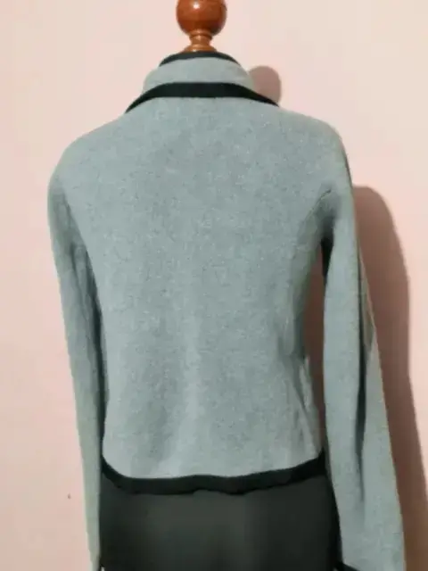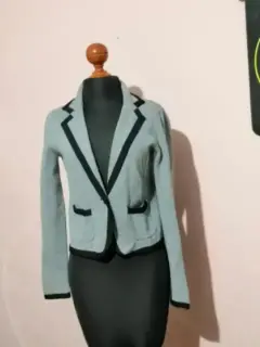 Saco en tela de punto tipo suéter queda a la.cintura es talla chica da en talla 28-30mx,. tono gris claro y bies negro se uso una vez pero no tiene ningún ningún detalle