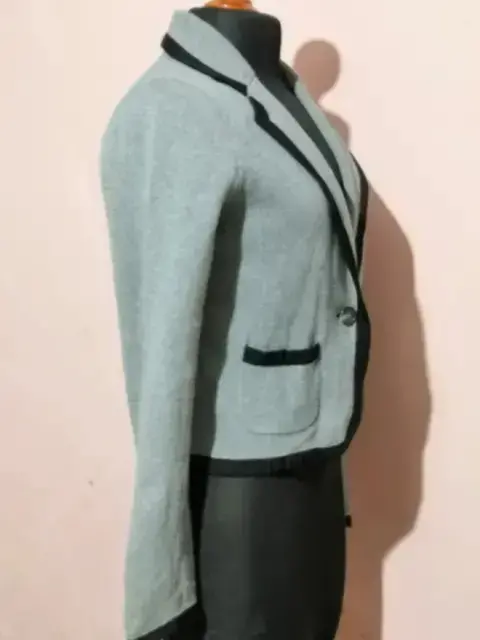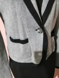 Saco en tela de punto tela gruesa. Saco en tela de punto tipo suéter queda a la.cintura es talla chica da en talla 28-30mx,. tono gris claro y bies negro se uso una vez pero no tiene ningún ningún detalle