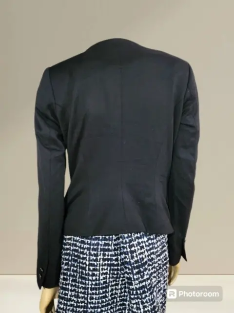 Saco Formal Blazer H&M, talla 14, color negro solido, cuello en V, Manga larga, hombros semiachonados, acentos de botones al frente, bolsas faux, Hecho de polyester y algodon, mide 40cm de hombro a hombro, 50cm de axila a axila, 42cm de cintura, 64cm de largo del hombro hacia abajo con 60cm de Manga, previamente usado en buen estado cosmetico.