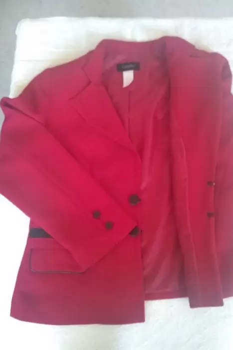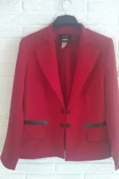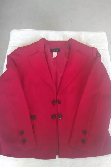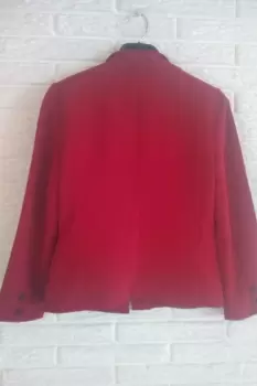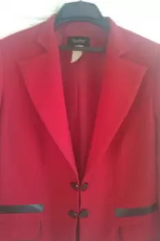 Saco tipo blazer, de la Marca Vanity, en color rojo con detalle en negro, talla 30, se abrocha al enfrente, bolsas al frente, largo a la cadera, 100% poliéster, forro 100% poliéster, lavado y planchado en casa, excelentes condiciones, solo un pequeño detalle en la bolsa derecha, un rayon de bolígrafo, casi imperceptible, como se puede ver en la última foto. Se entrega con repuesto de botones. Se entrega tal y como se ve en las fotos. El costo en tienda es de $ 850.00, lo vendo en $ 400.00