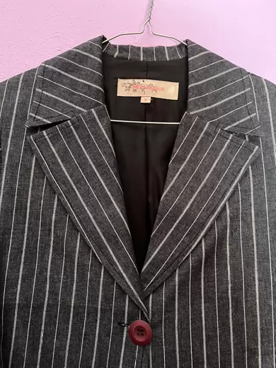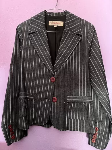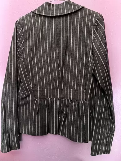 Saco para dama color gris oscuro con rayas blancas. Tiene todos sus botones, está en perfecto estado para un outfit formal. Talla M