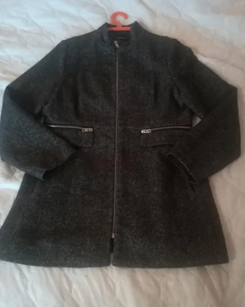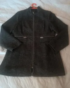 Elegante saco recto, cuello largo, jaspeado con cierres a los lados semi largo en buen estado casi nuevo