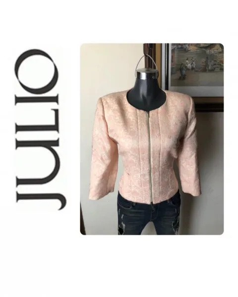 Saco Julio. Hermoso saco de la prestigiosa marca Julio con detalla de cierre en la parte final de las mangas y bolsas en ambos costados. talla 6: axila a axila Mide 49cm. Tiene una pequeña mancha de humedad, y una diminuta apertura en una manga sin embargo con una buena tintoreria se quita la macha. También tiene pelusitas por el uso(aprecia en fotos). Detalles mostrados en fotos