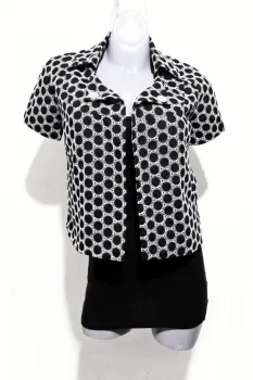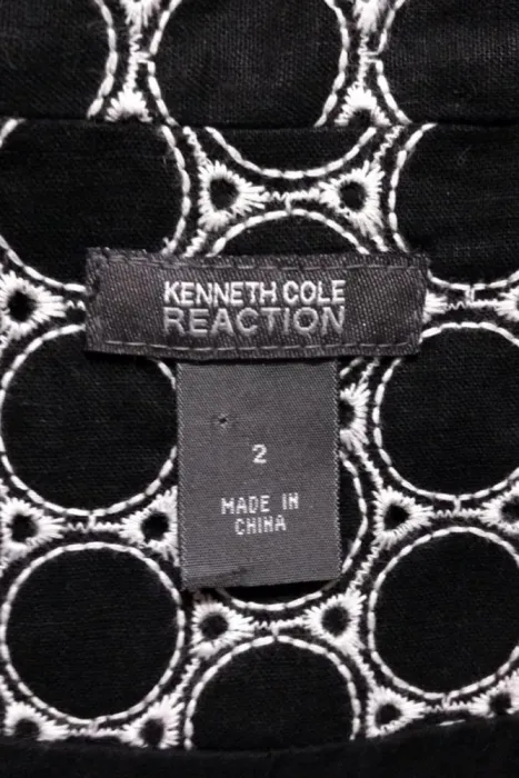SACO KENNETH COLE TALLA 2. COLOR NEGRO CON BLANCO, 53% LINO, 47% ALGODON, MANGA CORTA, TALLA EXTRA CHICA, MEDIDAS DE UNA CARA: AXILA A AXILA 46 CM, LARGO 54 CM.