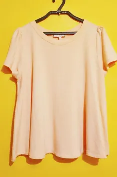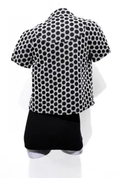 COLOR NEGRO CON BLANCO, 53% LINO, 47% ALGODON, MANGA CORTA, TALLA EXTRA CHICA, MEDIDAS DE UNA CARA: AXILA A AXILA 46 CM, LARGO 54 CM.