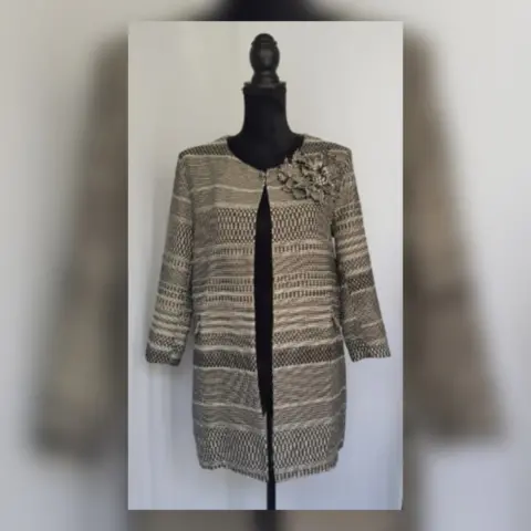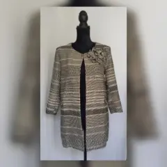 Saco Largo aplique Flor. Saco largo corte évase bitono BLANCO LINO/NEGRO, cuello redondo, aplique flor mismo tejido, cierre p/ganchillo, 2 bolsos simulados c/tapeta y manga 3/4. Talla G. Dimensiones cms: 42 hombro, 54 axila, 56 zona baja, 81 largo, 51 largo manga. 70% algodón, 20% poliéster, 6% acrílico, 4% elastano. P/lavado en casa.***NO ESTIRA, ES RÍGIDO***HECHO EN ITALIA***