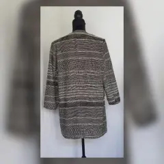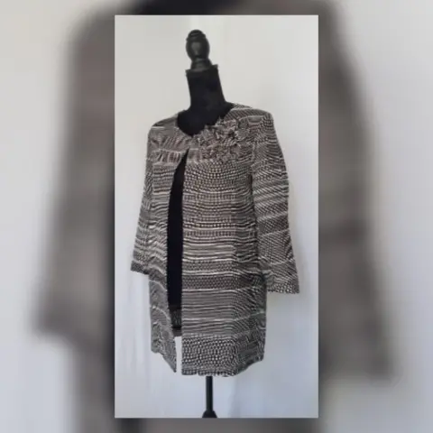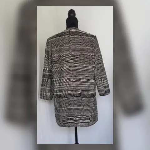 Saco largo corte évase bitono BLANCO LINO/NEGRO, cuello redondo, aplique flor mismo tejido, cierre p/ganchillo, 2 bolsos simulados c/tapeta y manga 3/4. Talla G. Dimensiones cms: 42 hombro, 54 axila, 56 zona baja, 81 largo, 51 largo manga. 70% algodón, 20% poliéster, 6% acrílico, 4% elastano. P/lavado en casa.***NO ESTIRA, ES RÍGIDO***HECHO EN ITALIA***