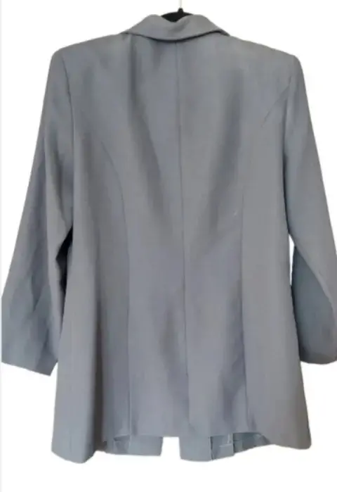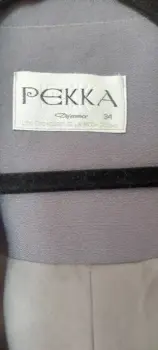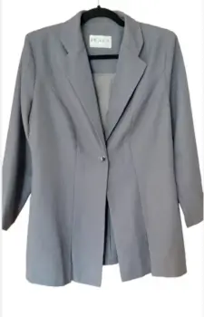 Saco largo color gris, talla 34, marca pekka, boton único frontal, manga larga , aperturas laterales. Cuenta con hombreras. Cómodo y formal.