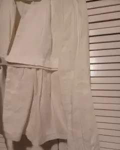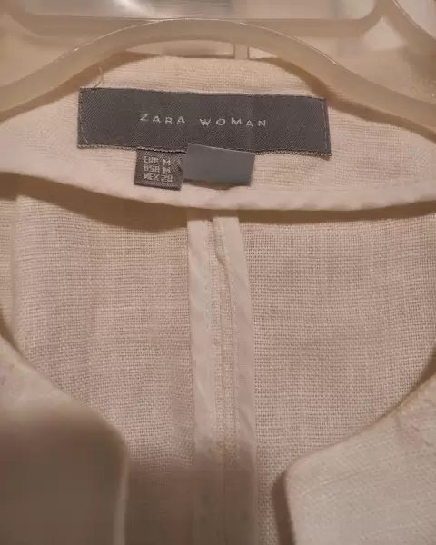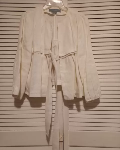 Hermosos saco de lino.Detalle de pliegues, pinzas, olanes y lindo listón para amarrar al frente.Solo se usó una vez está prácticamente nuevo.