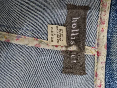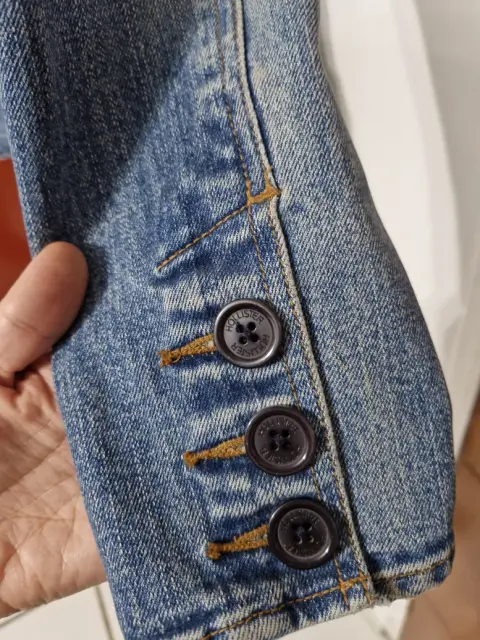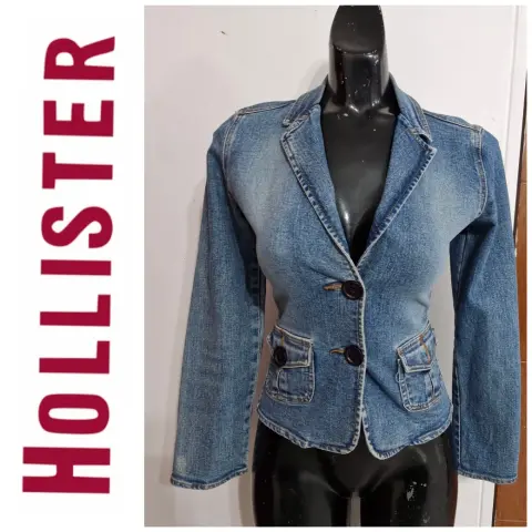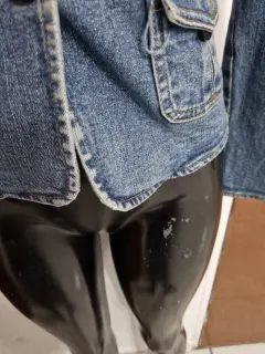 Hermoso blazer mezclilla excelente marca tiene spandex ! Lo use muy poco ya no me queda checar imágenes tal cual esta se va, el efecto es deslavado. Rematee
