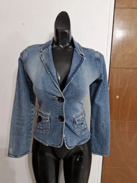 Saco mezclilla. Hermoso blazer mezclilla excelente marca tiene spandex ! Lo use muy poco ya no me queda checar imágenes tal cual esta se va, el efecto es deslavado. Rematee