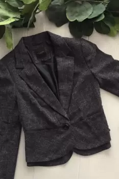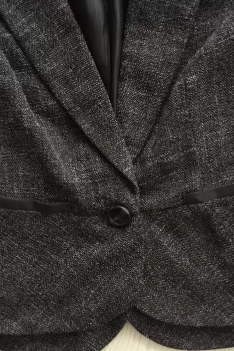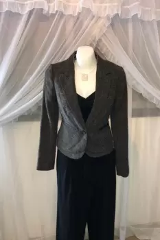 Blazer tono gris o cafe tela, viene con un unico boton al frente, estilo vintage, trae forro y simulacion de bolsillos, con hombreras, en la parte de al frente trae el final una tela encima de otra para verse asi en capas termina en corte circular.MedidasHombro a hombro: 39 cmcintura: 80 cmlargo: 53 cmancho de brazo parte alta: 32 cm