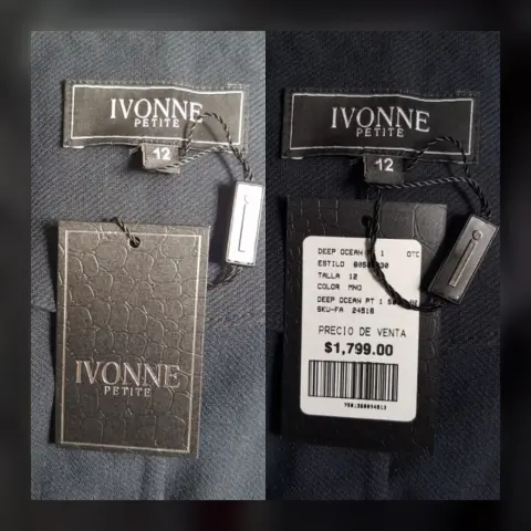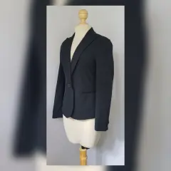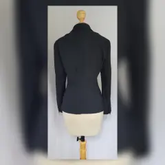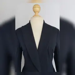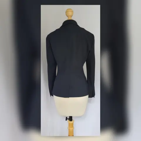 Saco tradicional color AZUL DE PRUSIA (más oscuro que azul marino), cuello clásico c/solapas muesca, cierre p/botonadura, 2 bolsos vivo y manga larga terminada en botonadura. Talla 12. Dimensiones cms: 45 hombro, 51 axila, 47 cintura, 54 zona baja, 61 largo, 60 largo manga. 46% poliéster, 24% poliamida, 23% viscosa, 7% elastano. P/lavado en seco.