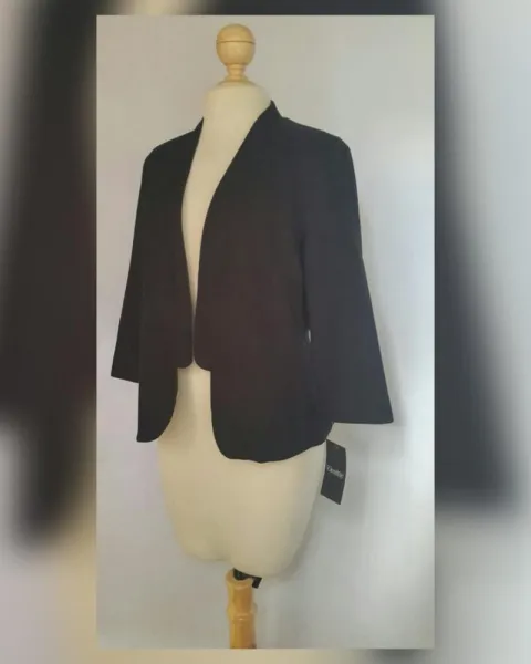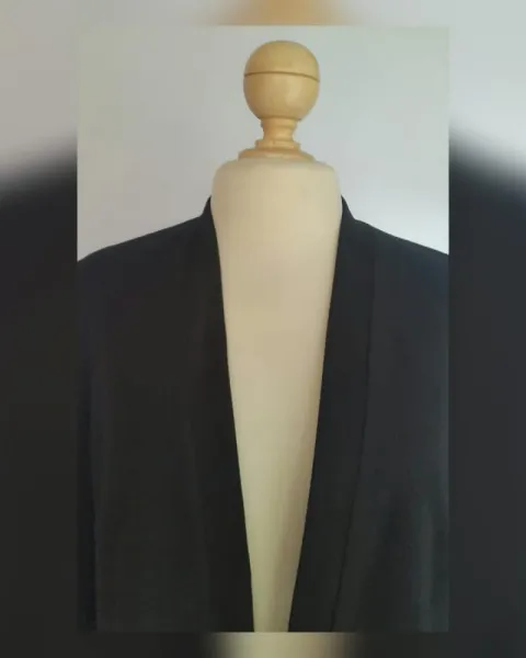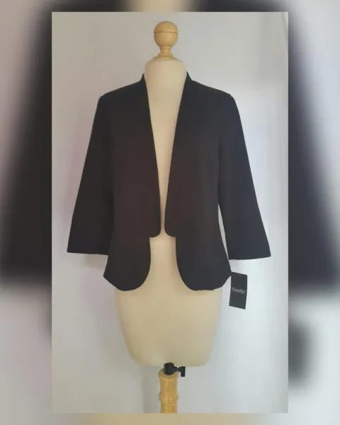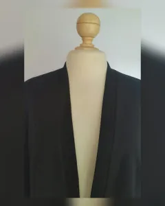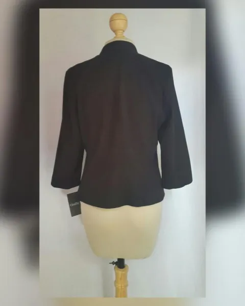 Saco vestir estilo Spencer color NEGRO ÉBANO, cuello pico, sin sistema de cierre, manga 3/4, hombreras insertadas y forro fantasía interior. Talla 34 (REDUCIDA, da mejor a 32). Dimensiones cms: 40 hombro, 54 axila, 48 cintura, 58 zona baja, 56 largo, 47 largo manga. 92% viscosa, 5% elastano. Para lavado en seco.