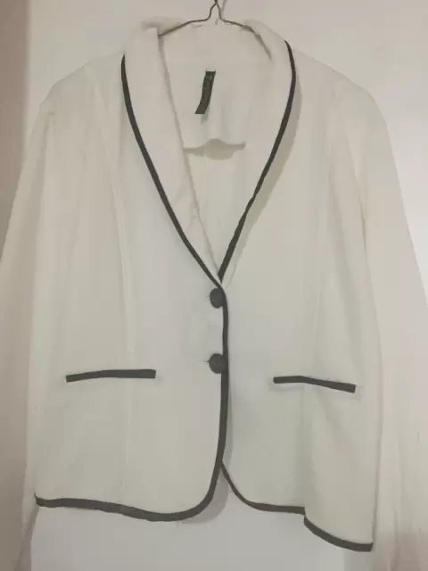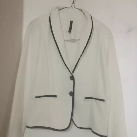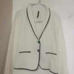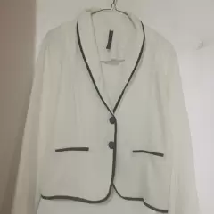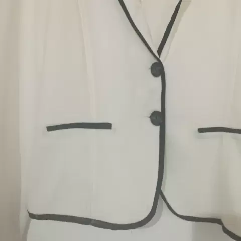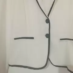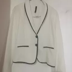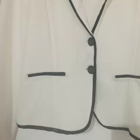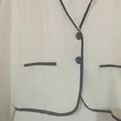 Saquito blanco con bies negro. Saquito blanco con rivetes negros, ligero de axila a acila mide 49 cm de axila a axila y 54 cm de largo; tela fresca