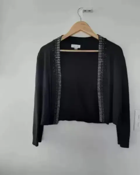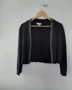 Hermosa torera negra Calvin Klein con detalles de piedras de fantasía. Está en excelente estado, solo se usó una vez pero me quedó un poco grande. Se ve muy linda!!
