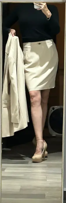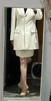 Traje falda y saco beige. Traje de 2 piezas beige, saco largo y falda arriba de la rodilla, espectacular!!! Talla 30, poliéster