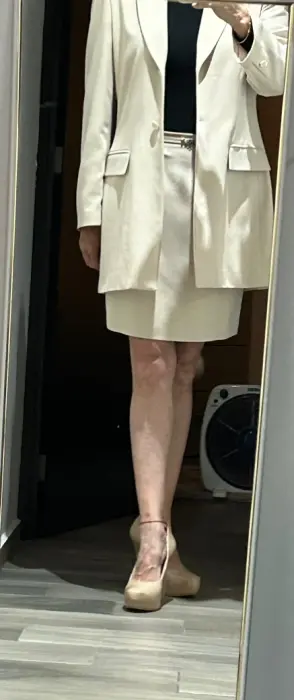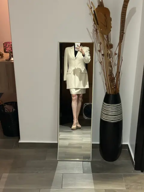 Traje de 2 piezas beige, saco largo y falda arriba de la rodilla, espectacular!!! Talla 30, poliéster