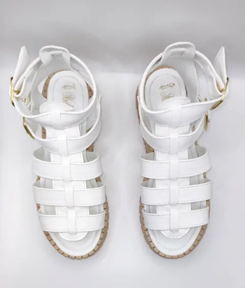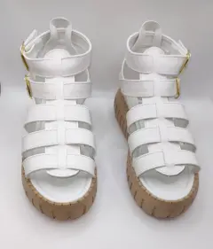 Padrísimas sandalias color blanco, vinipiel diseño de gladiador romano doble correa con ebillas ajustables, suela plataforma 5cm es ligera muy cómoda. Mexicano Número #25cm. Si es tu primer compra en la App busca Código Promocional de descuento -$100 en tu primera compra: lucyrmxXqQJ9