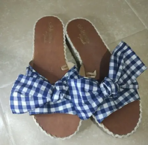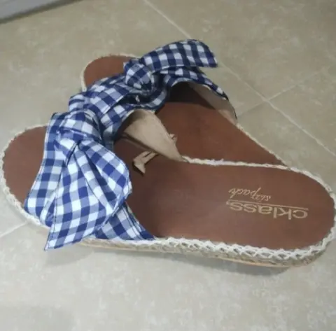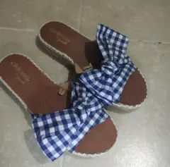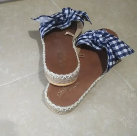 Sandalias de tela estilo lona. Estampado de cuadros en color blanco y azul marino. Moño de decoración. Ligera plataforma Súper cómodas.Utilizadas 1 sola vez.