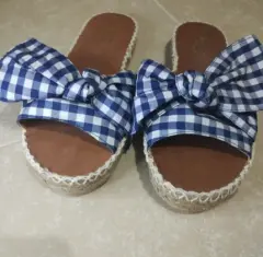 Bonitas cómodas sandalias.. Sandalias de tela estilo lona. Estampado de cuadros en color blanco y azul marino. Moño de decoración. Ligera plataforma Súper cómodas.Utilizadas 1 sola vez.
