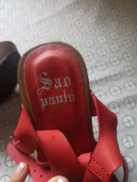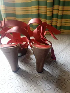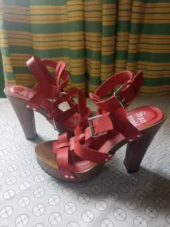 Sandalia. Sandalia color rojo, tacon grueso de madera 10 cms, con cintas