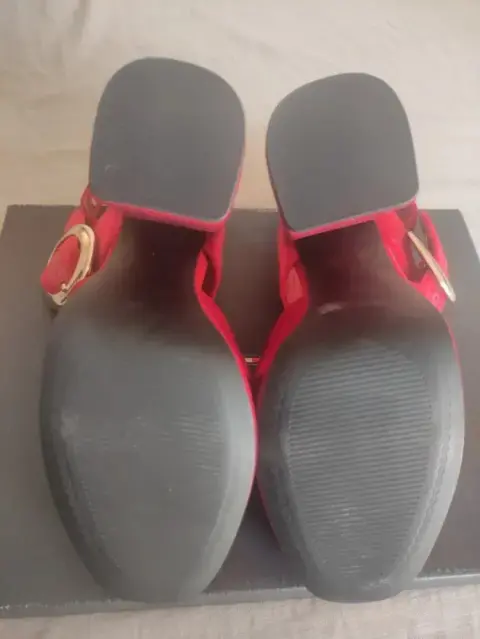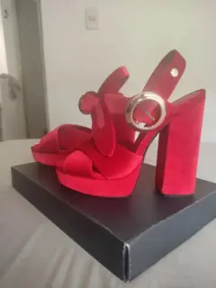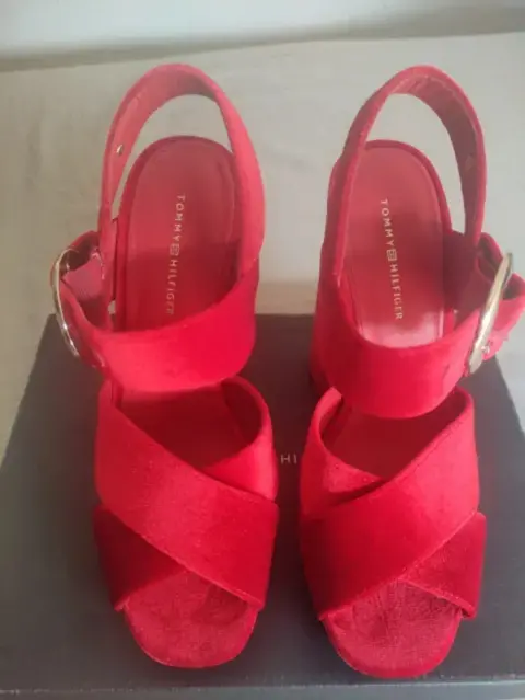 Sandalia en gamuza color rojo marca Tommy Hilfiger. Completamente nuevas en su caja. Tacón de 13 cm de altura.