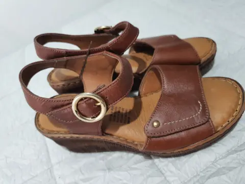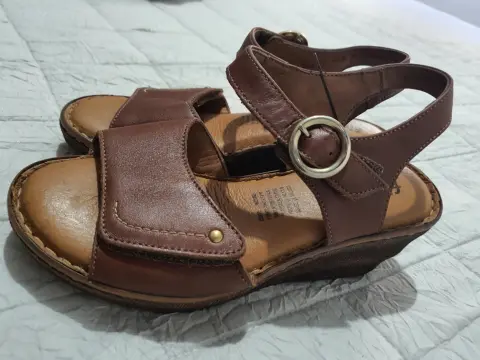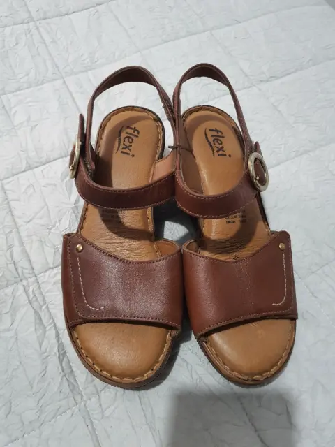 Sandalia de piel en color cafe, se desprende de la parte de enfrente para ajustarse al tamaño muy comoda para caminar. Tacon de 4cm marca Flexi