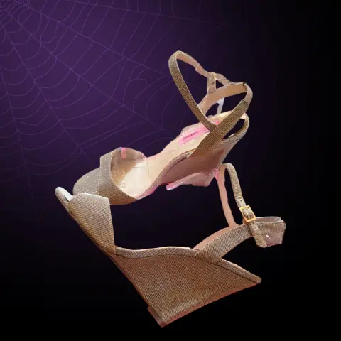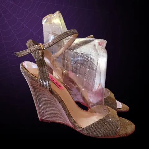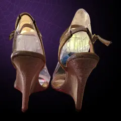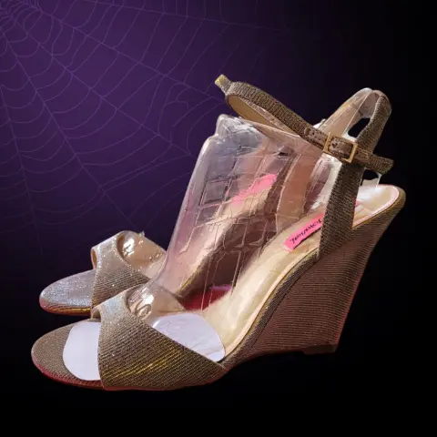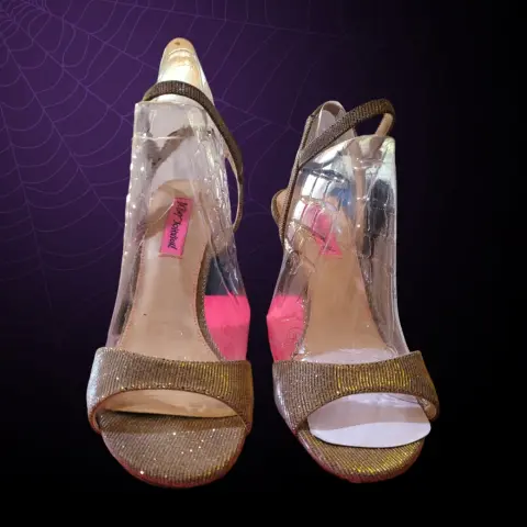 Sandalia de tacon Betsey Johnson, talla 26, color dorado, plantilla semiacolchonada, cierre de broche al tobillo, elastico enparte de atras, punta abierto, suela antideslizante, tacon con 12cm de alto, hechos con material sintetico y cuero, nuevos a estrenar con caja original en buen estado cosmetico.
