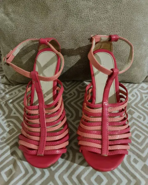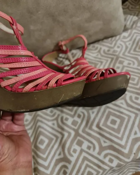 SANDALIA PINK CHAROL!!TACON PUENTE!. SANDALIA PINK!! COLORES ROSADOS! TACON PUENTE! CHAROL TALLA: 4.5 / ALTO: 10.5cm Plataforma: 2.5cm/ Detalles de raspones en TACON PUENTE por otros zapatos nada grave para su uso!!,Todo el charol de la sandalia está en excelente condición para que ya las uses!!