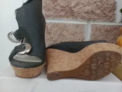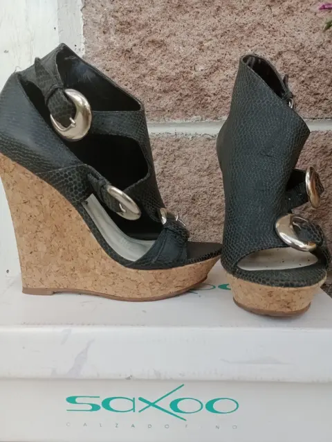 Sandalia de plataforma muy sexy, para usarse con pantalón o vestido. Plataforma de 12cm en la parte de atrás y 9 de enfrente. Tiene detalles de que se están peleando de adentro por qué llevan mucho tiempo guardados pero no afecta su uso.