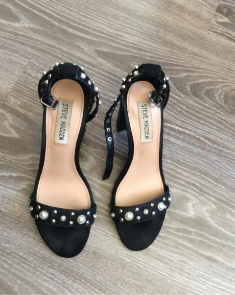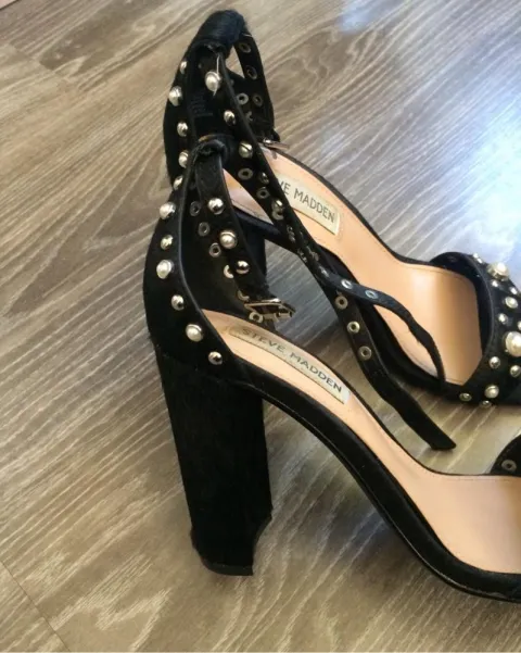 Sandalias altas Steve Madden. Son sandalias con estoperoles y perlas, están en perfecto estado, son de pelo de poni, elegantes y llamativas.