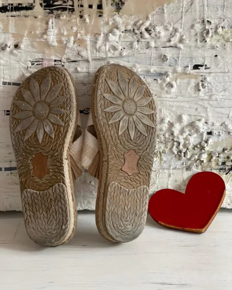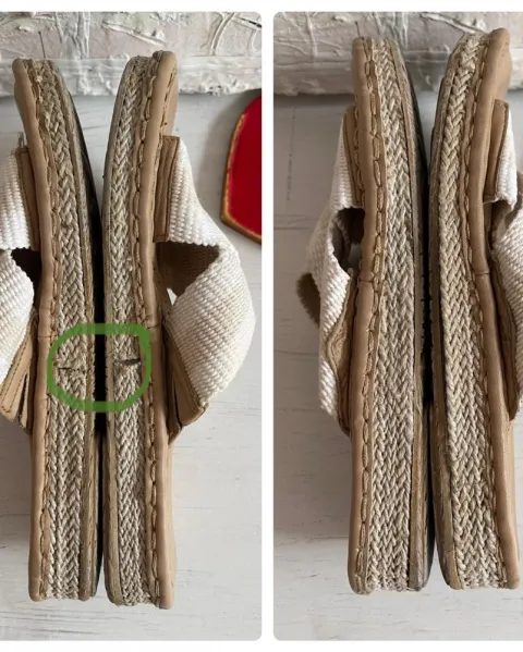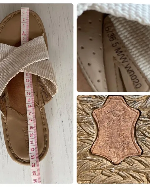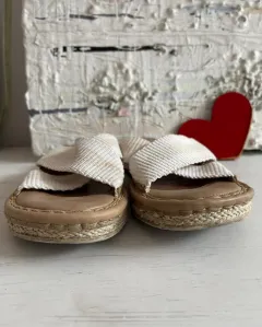 Talla: 6 americano = 23 mexicano y miden 24 cm.Sandalias con plantilla de piel y sensación cómoda, tipo cojín. Tiras cruzadas de tela beige con blanco que cuentan con resorte lateral para un mejor ajuste. La plataforma mide 2.5 cm.Detalles de uso se muestran en fotos.