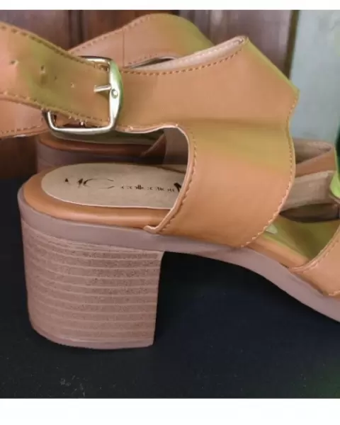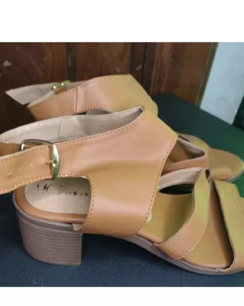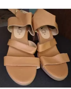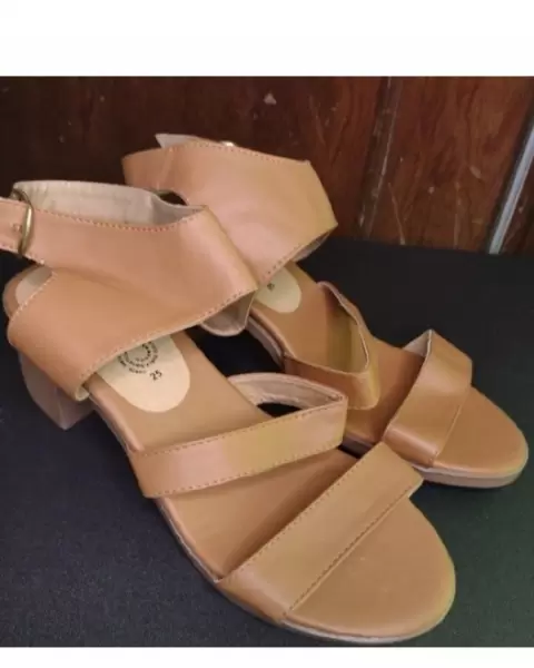 Hermosas sandalias con tacón Cafés tipo piel (es sintetico)La talla marca 25 pero vienen muy amplios quedan perfecto a talla 25.5 El tacón mide 5 CM Nuevos